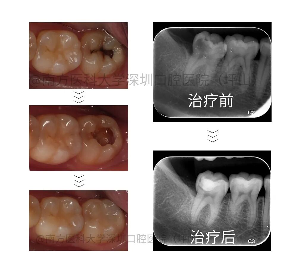 患者自诉左下后牙有洞,冷热刺激痛数月,影像检查显示 36 牙𬌗面深龋近髓,根尖未见异常。建议试行活髓保存治疗。一年后复查无异常。